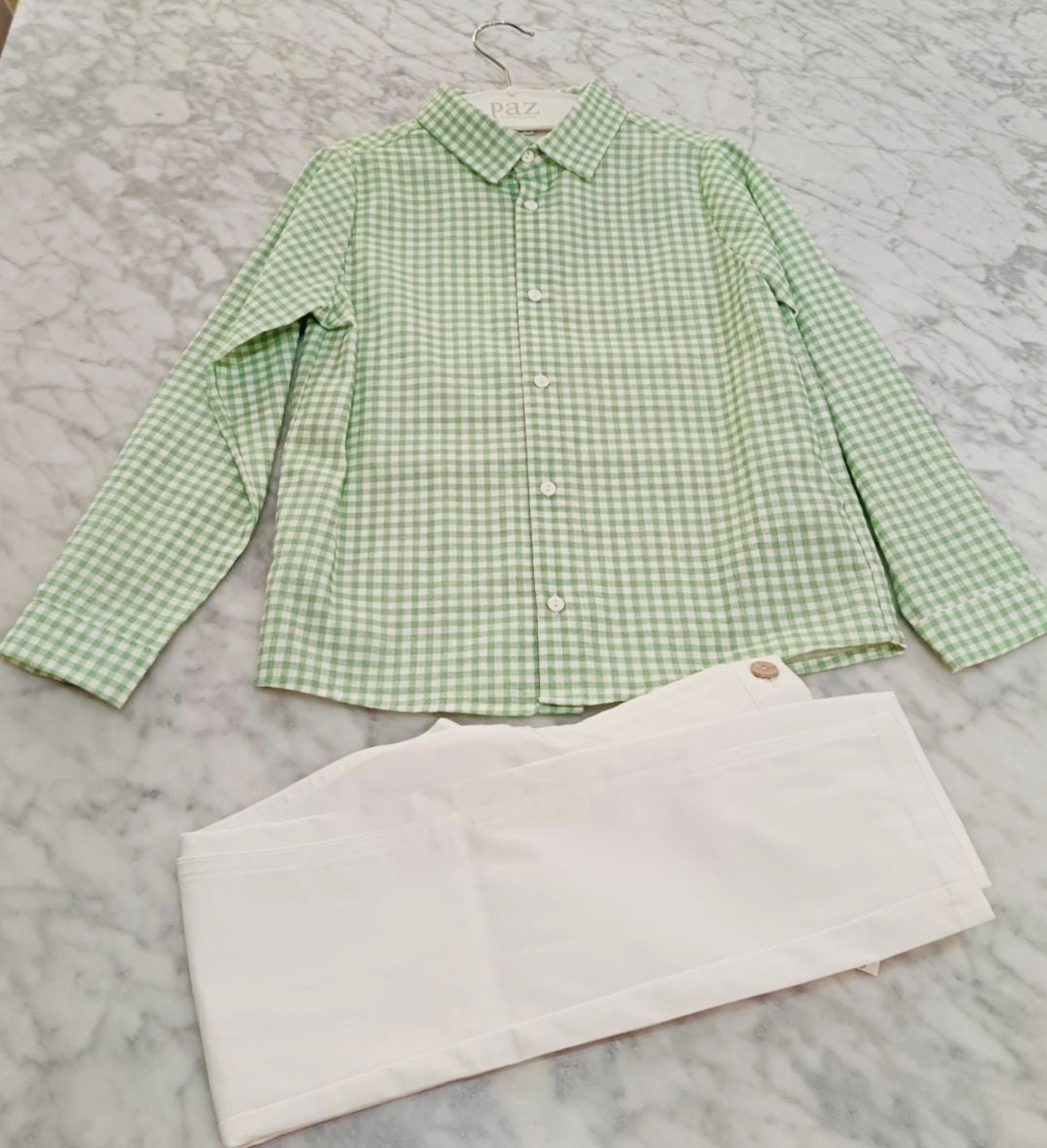 CONJUNTO CAMISA CUADROS VERDE. PANTALON BLANCO